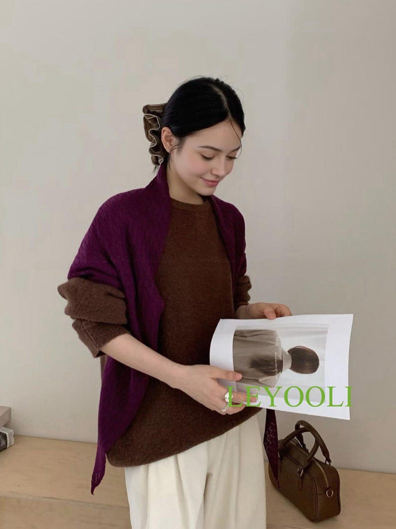 This deep plum knit triangle scarf adds a quiet elegance to your everyday outfits.