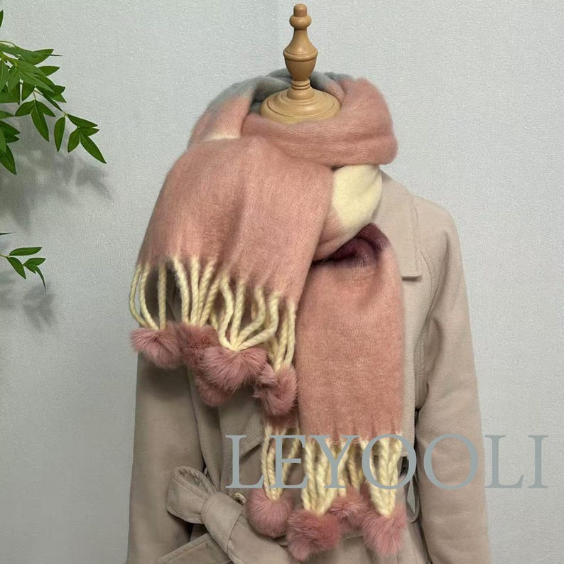 Rainbow Striped Mohair Scarf, Winter Warm Thickened Wool, Hairball Fringe
