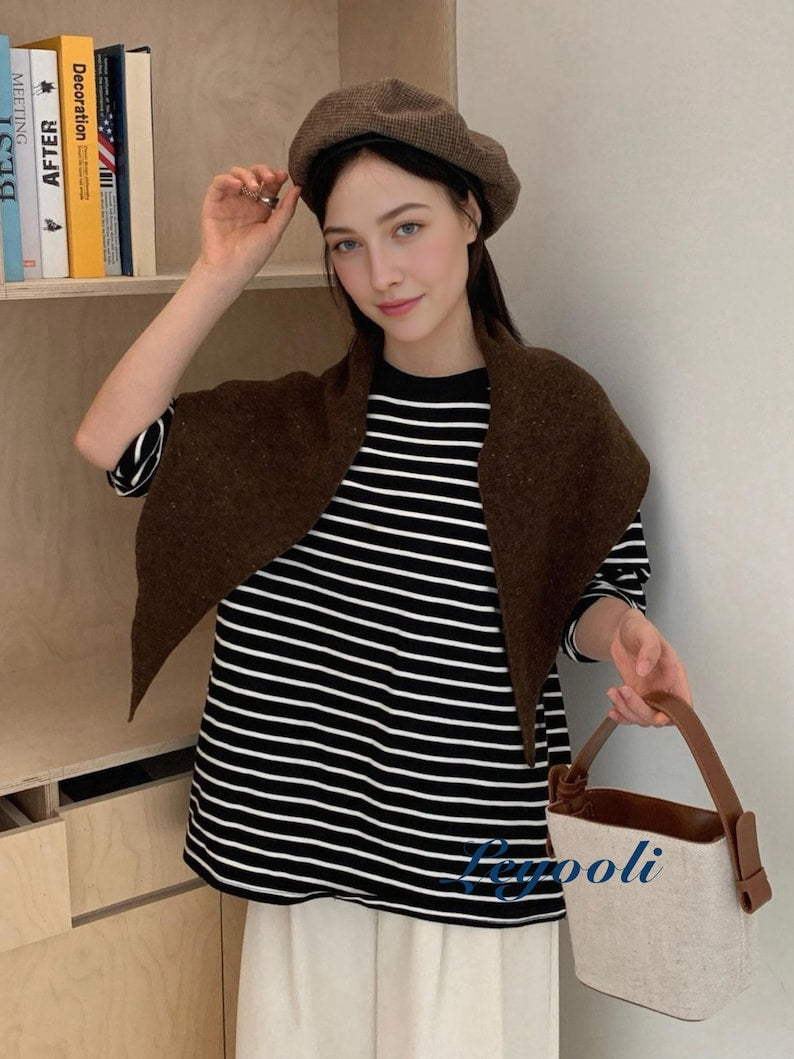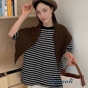 Speckled Brown 100% Wool Knit Triangle Scarf, Cozy Ribbed Shawl, Handmade Neutral Wrap